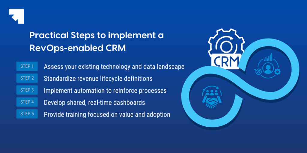 Implementing a RevOps-enabled CRM requires more than new technology. It starts with aligning people, processes, and data around a shared revenue goal. A structured and thoughtful approach ensures the CRM becomes a system teams rely on, not just another tool they are asked to use.