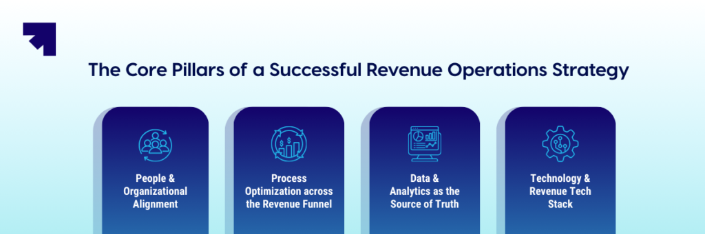 A strong Revenue Operations strategy is built on four key pillars that support alignment and efficiency across the organization.