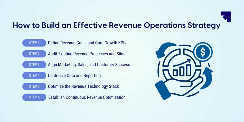 Building a strong Revenue Operations strategy requires a structured approach that connects teams, processes, and technology. When implemented correctly, RevOps helps organizations improve collaboration, gain better visibility into revenue performance, and create a more efficient growth engine. The following steps outline how businesses can build an effective Revenue Operations strategy.